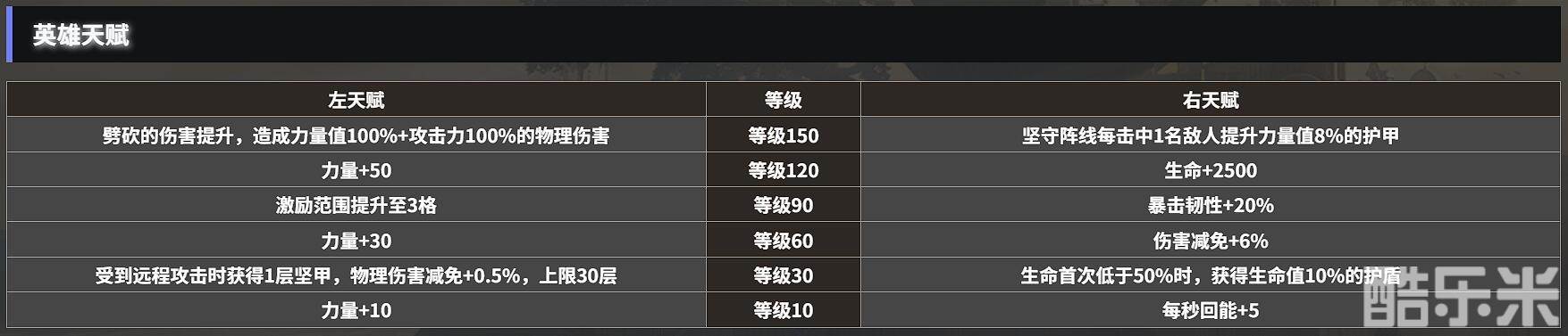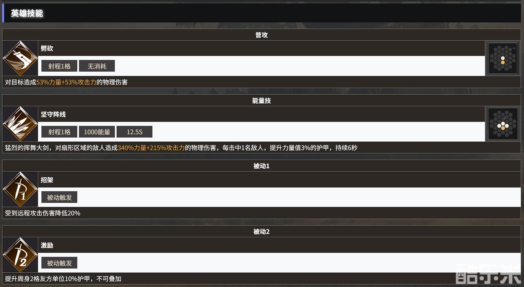 该角色的技能机制围绕团队减伤与控制展开。普通技皇家斩击对前方单体造成力量×80%+攻击力×50%的物理伤害,30%概率附加“缴械”效果(禁用敌方普攻3秒)、被动技“骑士光环”为自身及周围3格友方提供20%远程伤害减免,生命值低于50%时提升至30%。能量技“坚守之盾”消耗800能量生成力量×200%的护盾,持续8秒并嘲讽周围敌人、终极技“王国裁决”对前方扇形敌人造成力量×150%伤害,50%概率眩晕目标2秒。