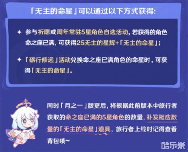 当玩家通过祈愿或周年常驻五星自选活动获得的角色已满命时,会自动获得25无主的星辉+1枚无主的命星。