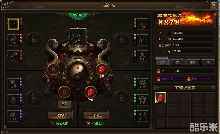 宝石分为4种宝石分别增加不同的属性,每种宝石对应可镶嵌的部位,宝石镶嵌可更换装备