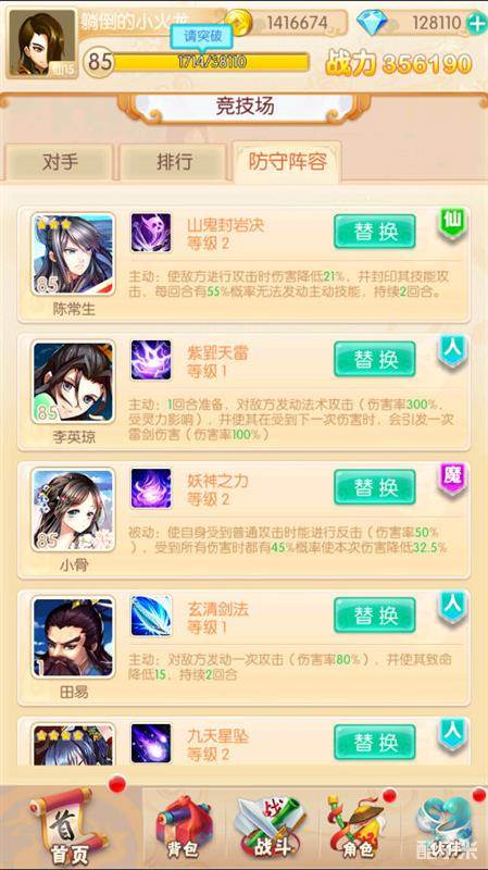 防守阵容:道友打上排名之后,还需要防备其他人把自己打下去,这个时候就需要来安排自己的防守阵容了,防守阵容最多可以安排6名伙伴,快去研究一下他们之间的配合吧。