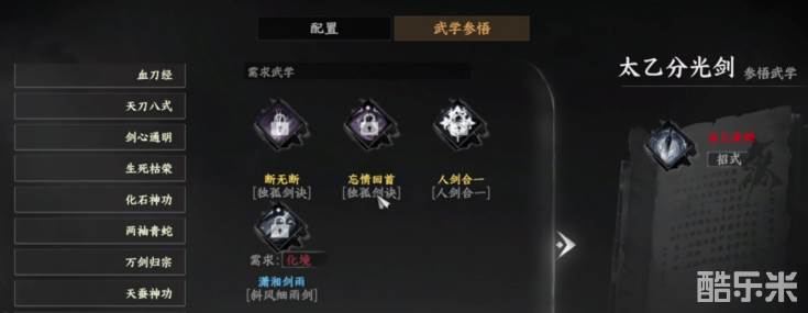 你进入武学系统在地阶武学的列表中找到“太乙分光剑”,你会发现它包含了四个剑诀,每一个剑诀都有自己独特的要求,必须全部解锁才能完全掌握这门剑法。接下来给大家拆解每一个步骤,保证让你顺利拿到太乙分光剑。