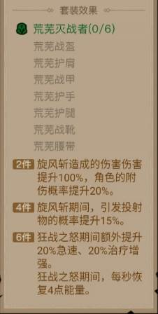荒芜灭战者套装以旋风斩为主要强化点,两件四件套效果为旋风斩直接强化,六件套效果为针对狂战之怒终极技能强化。
