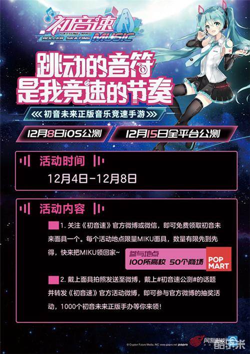 在公测即将开始之际,《初音速》官方也为玩家们准备了一份礼物。12月4日到12月8日,在全国100所高校和50个商场,关注《初音速》的微博或微信就可以免费领取初音未来的面具哦!戴上面具并将自拍照发送至微博,带上#初音速公测#的话题并转发官方活动微博,就有机会赢得初音未来正版手办哦!