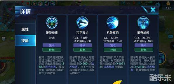 解析:一技能是墨子的位移技能(可以穿墙),一技能让墨子拥有了追杀和逃脱能力,释放后还会将下次的普通攻击变成能够击退敌人的炮击,让墨子拥有灵活性的同时不会缺少控制能力。