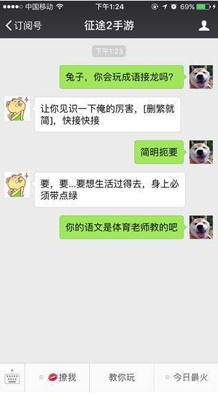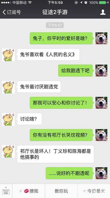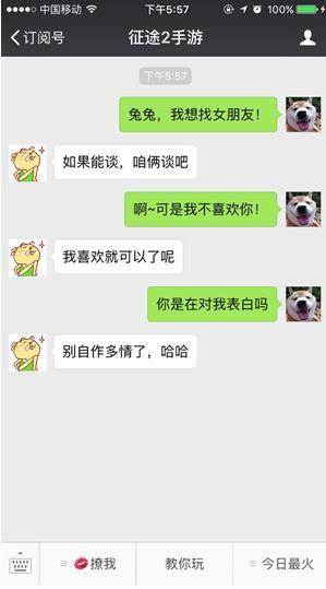 这只丑萌丑萌的兔子受到了广大《征途2手游》玩家,特别是女性玩家的欢迎, 而除了那些玩家熟知的表情包之外,如今在游戏的公众号上我们已经可以跟征途兔愉快的聊天了,不仅是游戏中的内容,连娱乐八卦我么您这只兔子也都了如指掌呢。