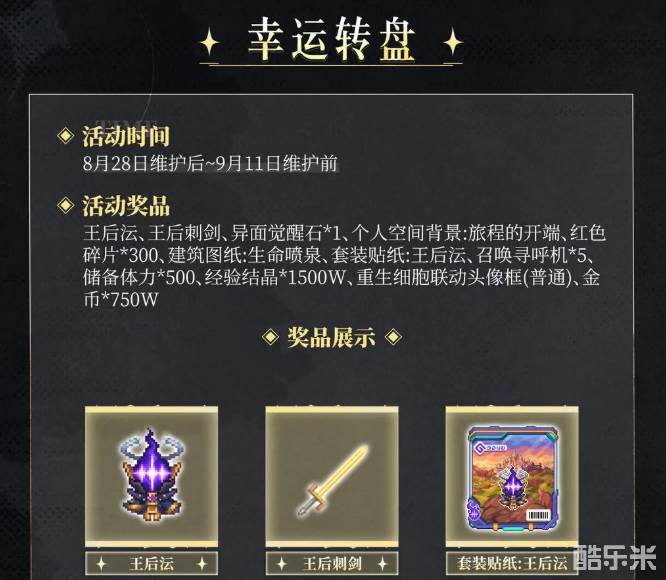 除了签到和时装,这次联动期间还推出了幸运转盘。通过参与幸运转盘,玩家有机会获得多种超值奖励,例如王后刺剑、异面觉醒石、经验结晶等等。这些道具在游戏中非常有用,不管是提升实力还是加快升级