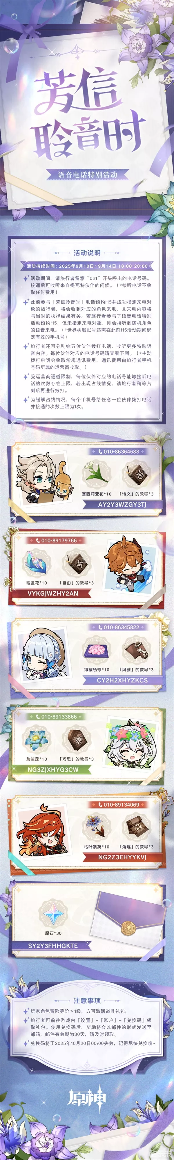 ●此前参与「芳信聆音时」电话预约H5并成功指定来电对象的旅行者,将会收到对应的角色来电,且来电内容将与当时的抉择结果有关。若旅行者参与了语音电话特别活动预约H5,但未指定来电对象,则会接听到随机角色的语音来电。(*世界树服账号还需在此前H5活动期间绑定有效的手机号)