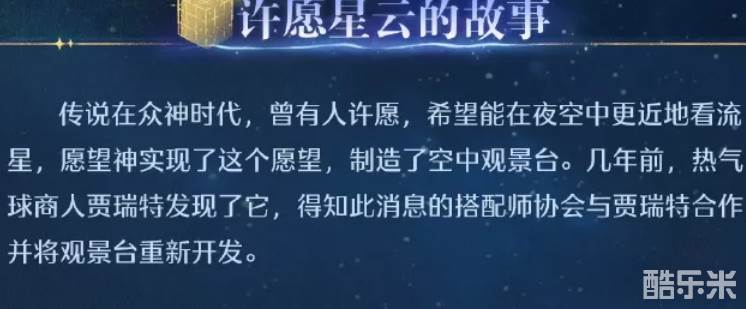 传说在众神时代,为了实现人们在夜空中更近观看流星的愿望,愿望神制造了空中观景台,但只有心愿原野的流星观景台被称作许愿星云。
