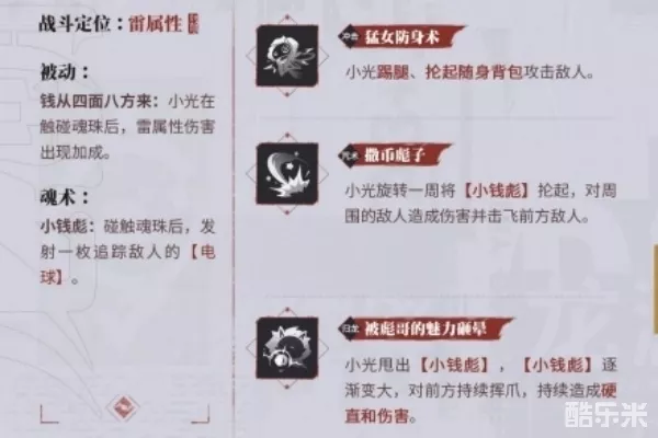 光是游戏中的虬龙阶的角色,和缠缠同属于目崖职业,被动技能可以释放魂珠,敌人触碰后可以发射一枚追踪敌人的点球,冲击技能小光踢腿、抡起随身背包攻击敌人。各位玩家可以参考一下。下面和酷乐米小编一起来看看吧