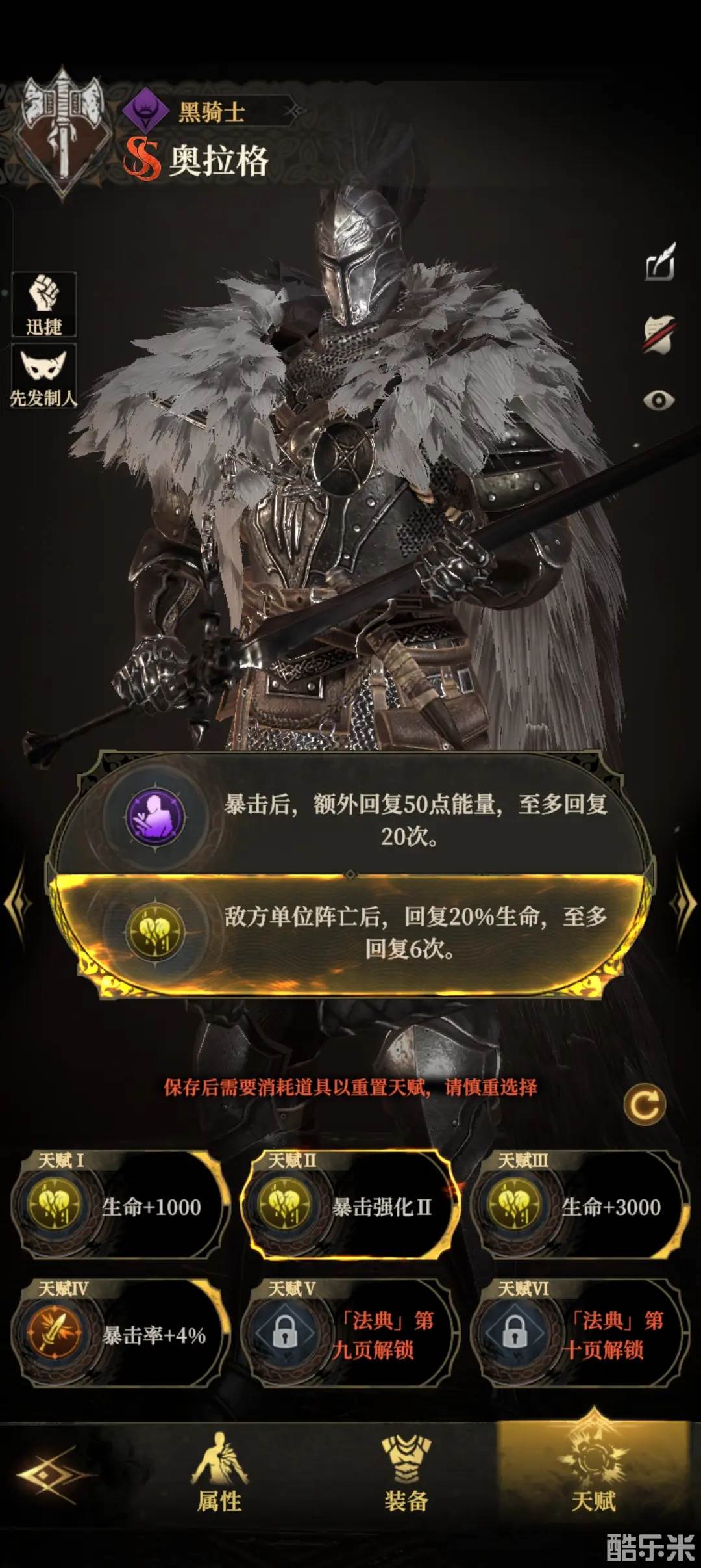 等级提升到5,建议左边加点”生命低于50%时获得30%伤害吸血效果”,右边可点”生命低于50%时获得隐匿”;等级提升到20,左天赋加点”存在相邻友方时,获得15%伤害吸血效果”;右天赋建议”缭乱斩击会提供10%伤害增强”。