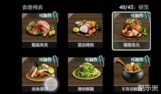 游戏中的食材分为肉类、鱼类、蔬菜、蘑菇、水果和调味品六大类,通过不同组合可以制作出45种效果各异的料理。其中基础的单组合料理最容易获取,如粗盐腌肉只需1个肉类,糖醋鱼丸需要1个鱼类,这些简单料理适合新手期快速制作。双组合料理如鱼香肉丝(肉+鱼)和清炖翠鱼汤(鱼+蘑菇)则能提供更好的属性加成,是中期过渡的首选。