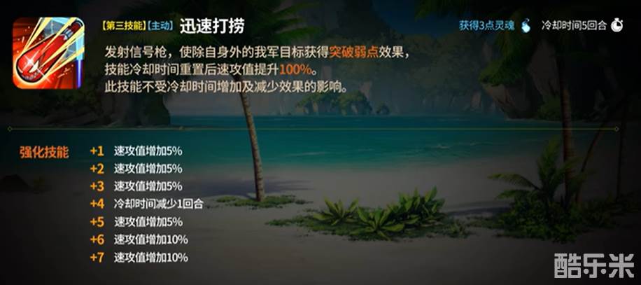 亚澜的主动技“别动”能够扬起沙尘攻击敌方目标,拥有基础35%的眩晕概率,消耗灵魂燃烧后概率可提升至100%,同时根据自身最大生命值为全队回复等比生命。强化技能后,不仅冷却缩短,还能增加速攻值,为队伍提供进一步的节奏优势。她的终极技能“迅速打捞”则更强调团队作战,释放后可让除自身外的队友获得“突破弱点”效果,并在技能冷却重置后直接提升速攻值,为持续输出或循环控场提供条件。