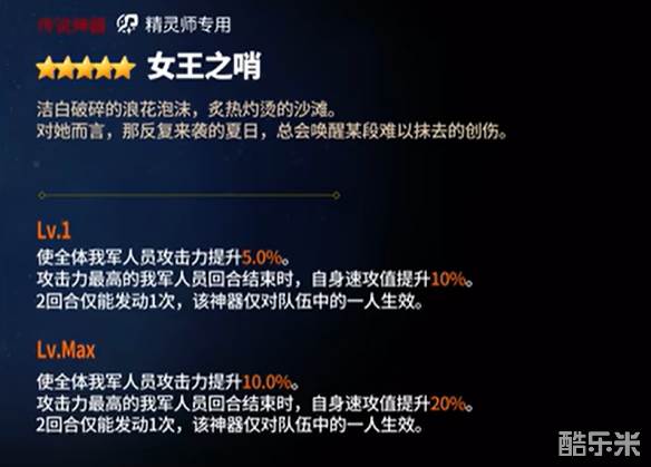 在装备方面,她的专属神器“女王之哨”可以在1级时为全体队友提供5%攻击提升,并在回合结束时额外提高攻击力最高角色的速攻值,满级后增幅翻倍,极大地增强了团队节奏与输出能力。