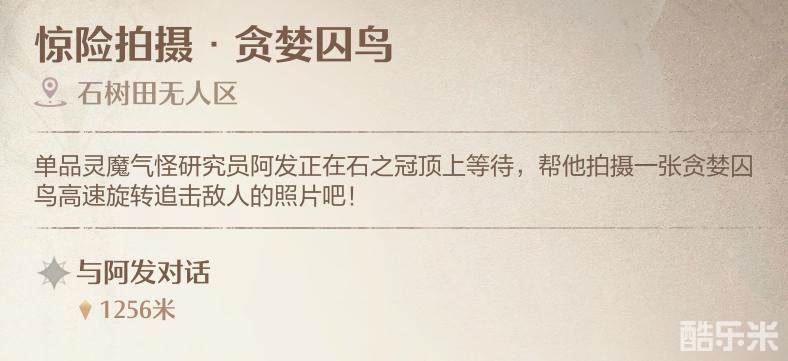 惊险拍摄贪婪囚鸟需要我们拍摄贪婪囚鸟高速旋转追击敌人的照片,大家需要去石树田无人区拍摄,下面酷乐米小编给大家带来的《无限暖暖》惊险拍摄贪婪囚鸟任务攻略,感兴趣的小伙伴们一起来看看吧。