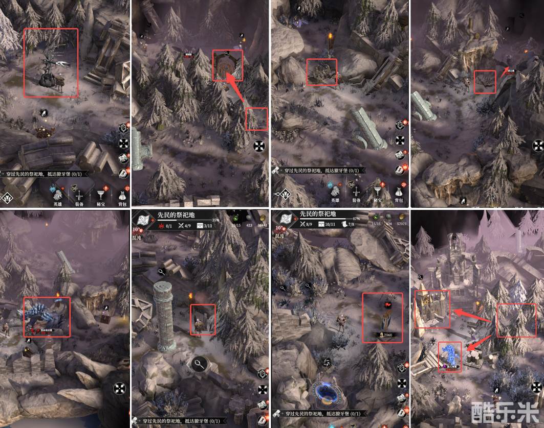抵达祭祀地深处后,会触发Boss战。击败Boss后会解锁通往獠牙堡的传送点。Boss旁边还有一块墓碑可对话,收获额外物资奖励。触发军团遭遇战,注意场上兵力要有2060。地图左下角,清除遮挡的杂草与树木后,会出现精英怪“冰石奎耶”,常位于初光特级神谕所附近,击败它能拿到不俗奖励。
