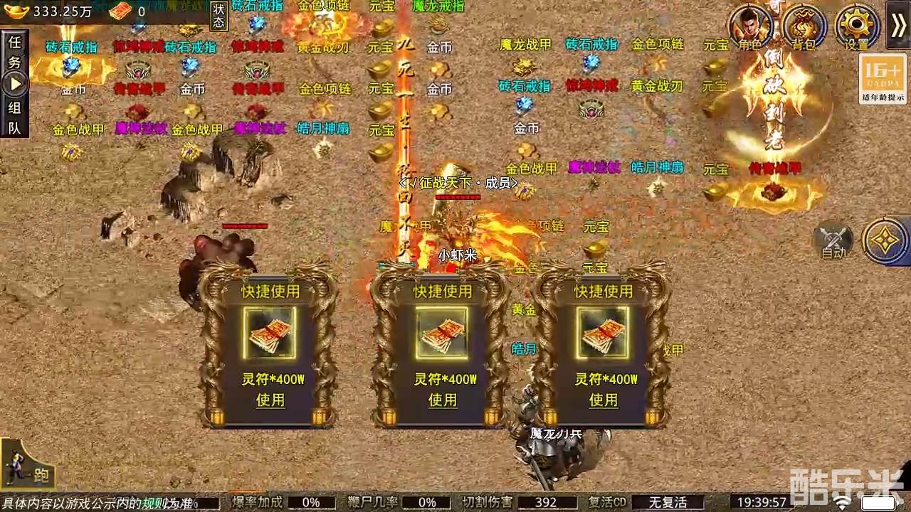 开启狂暴之力,加 20% 爆率,攻击 + 288,HPMP+2000,杀死玩家获得 50 灵符。