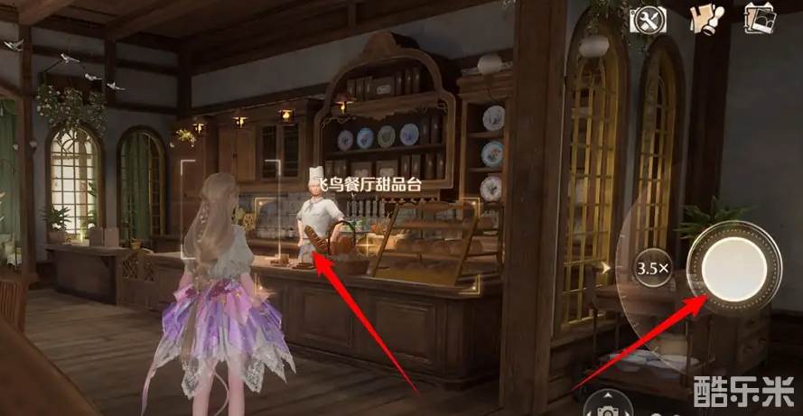 2、来到飞鸟餐厅甜品台前,点击照相机图标。