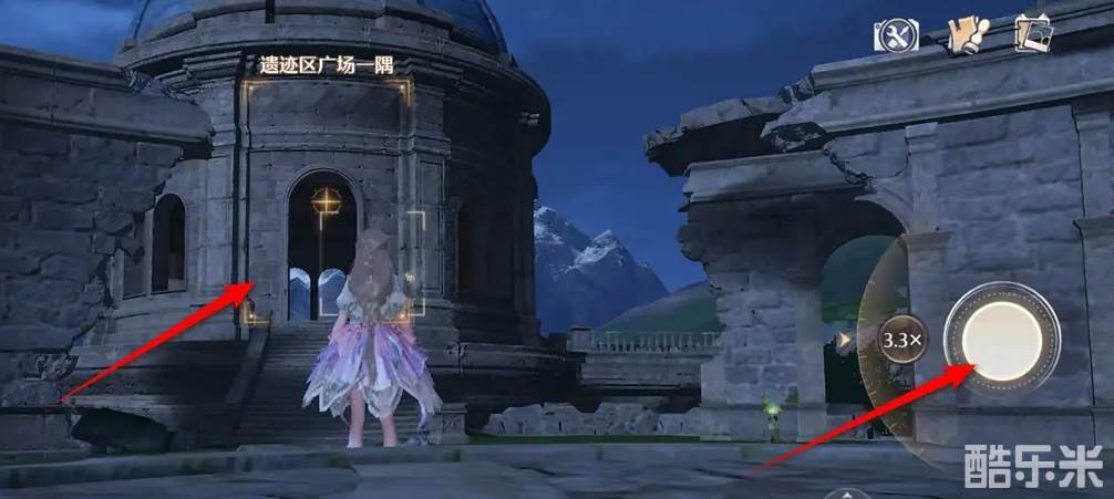 2、点击照相机图标,将相机对准遗迹区圆顶建筑并识别出“遗迹区广场一隅”后,点按相机快门。
