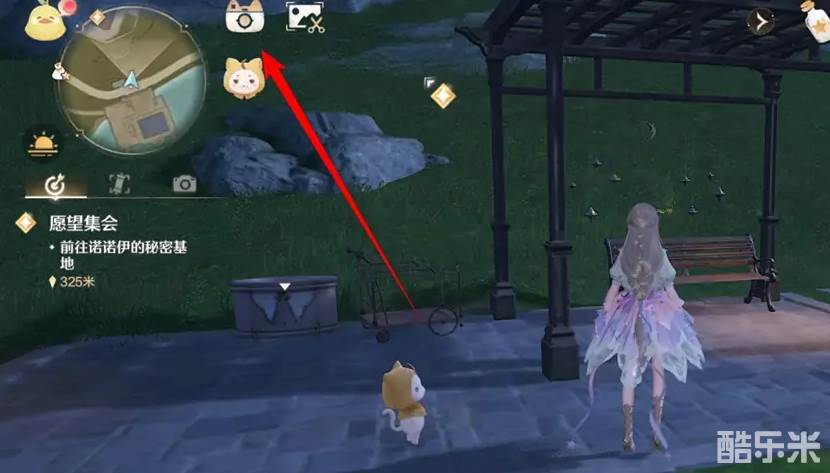 1、在无限暖暖手游,来到花愿镇码头长椅前,点击照相机图标。