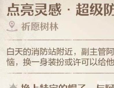 点亮灵感·超级防水任务需要在祈愿树林做,任务描述是:白天的消防站附近,副主管阿尔达正在为队员们没有防水的帽子而苦恼,换一身装扮或许可以给他一些灵感。下面酷乐米小编给大家带来了《无限暖暖》点亮灵感超级防水任务地点及攻略。