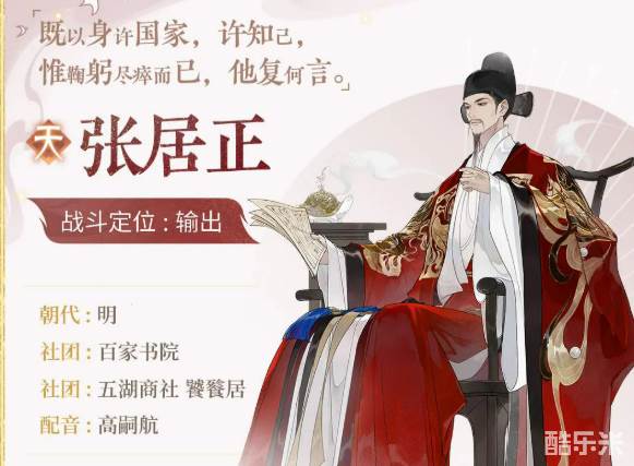 今天小编就带来忘川风华录张居正介绍。张居正的存在更像是一枚中枢棋子,掌控着团队节奏,决定着战局走向,下面和酷乐米小编一起来看看吧