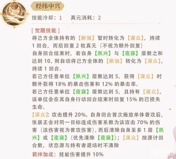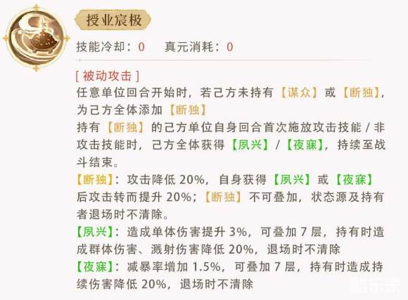 他的觉醒技能。这一技能可将【断独】转化为【谋众】,该状态不仅提升攻击20%,还允许他在普攻后追加一次70%伤害的打击,并移除身上部分状态层数。这意味着他可以在输出的同时清理冗余状态,实现循环利用。而当【夙兴】与【夜寐】的层数达到10时,还能自动触发【谋众】,进一步提升团队整体节奏的连贯性与输出效率。