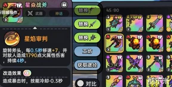 首先要提到的是星焱战斧。这款武器的高爆发能力使其在火属性武器中占据了一席之地。星焱战斧的技能效果是旋转斧头,每0.5秒造成高达1790点的火属性伤害,并持续4秒,同时还可提升角色的移动速度。改造方向上,推荐优先选择α-暴击火斧,因为暴击时技能冷却时间会大幅缩短,这使得玩家能够频繁释放技能,最大化输出。在获得途径上,玩家可以通过小镇深海活动宝箱或击杀小镇石头人后掉落的野猪来获取这把武器。星焱战斧的属性加成也不容忽视,提供的攻击力、暴击伤害和生命值提升,使其在战斗中极具竞争力。