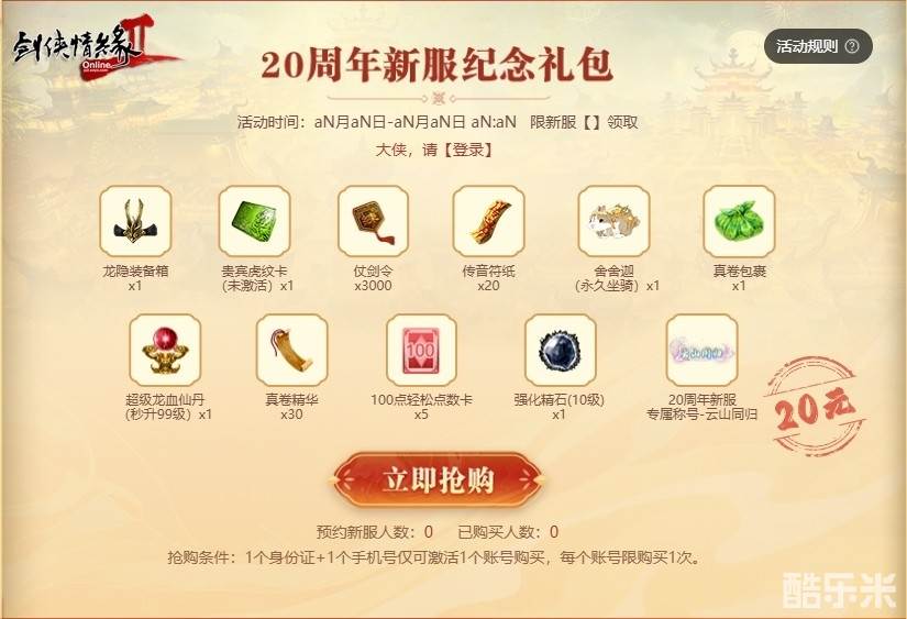 在礼包购买期间,大侠需要先在20周年庆活动专题页面激活账号,同1个身份证 + 1个手机号仅可激活1个账号购买,新服礼包限购1次,仅限在新服【云山同归】领取使用,且仅限账号下1个角色领取对应的礼包,道具均为绑定。