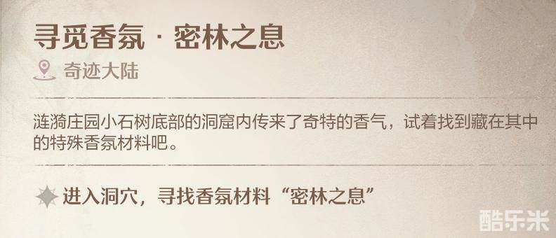 无限暖暖寻觅香氛密林之息任务需要我们进入洞穴寻找密林之息,传送到木桶小居去壳根据指引做任务!下面酷乐米小编给大家带来的《无限暖暖》寻觅香氛密林之息洞穴位置一览,感兴趣的小伙伴们一起来看看吧。