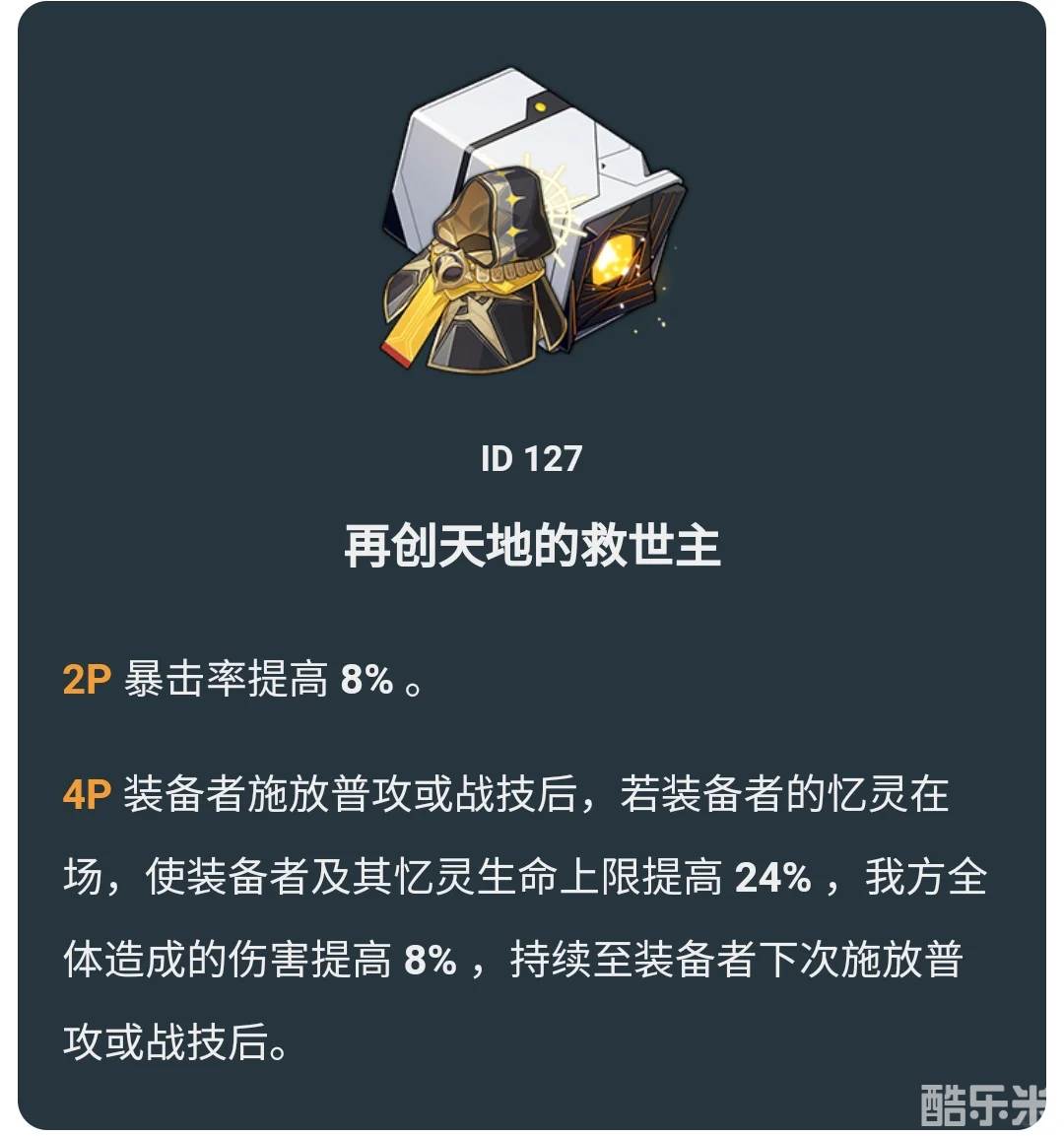 崩坏星穹铁道长夜月遗器怎么选,遗器套装可以选择:再创天地的救世主,2件套装可以增加:暴击率+8%,4件套会让普攻/战技后若忆灵在场,则提高生命上限 24% 并提升全队伤害 15%,该套装与长夜月机制高度契合,是最佳选择。下面和酷乐米小编一起来看看吧