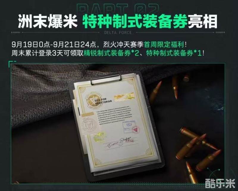 洲末爆米特种制式装备券亮相时间:9月19日0点至9月21日24点内容:累计登录3天可领取精锐制式装备券2、特种制式装备券1。
