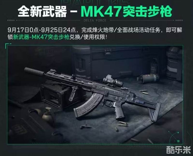 全新武器-MK47突击步枪时间:9月17日0点至9月25日24点内容:完成烽火地带/全面战场活动任务,即可解锁新武器-MK47突击步枪兑换/使用权限。