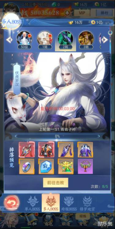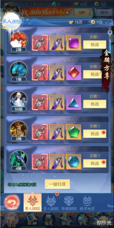 有单人BOSS跟多人BOSS,单人BOSS玩家每天只能打不高于自己等级的BOSS两次。