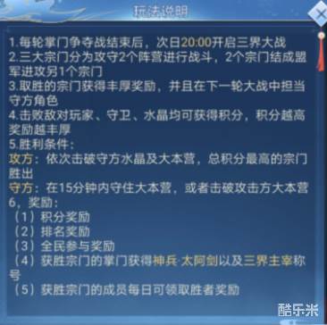 三界大战是不同宗门之间的比拼,开启时间是每轮掌门争夺战结束后,次日的20:00开启三界大战