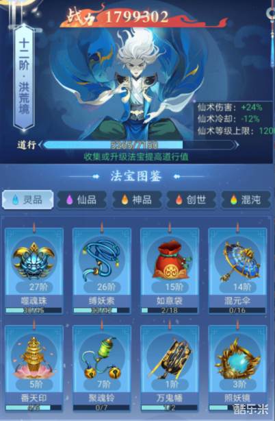 法宝是仙术的承载体,法宝境界值影响到技能的等级上限,法宝同样有品质颜色之