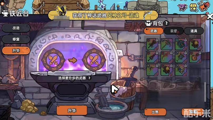 打开铁匠台从中找到武器升华的选项,进入武器升华的界面以后,我们可以看到左右各有一个空栏,左边的是武器栏右边是物品栏,把升华武器放到左边,元素石和武器图纸放到右边,在点以下升华按钮,静静等待几秒钟就完成升华了。