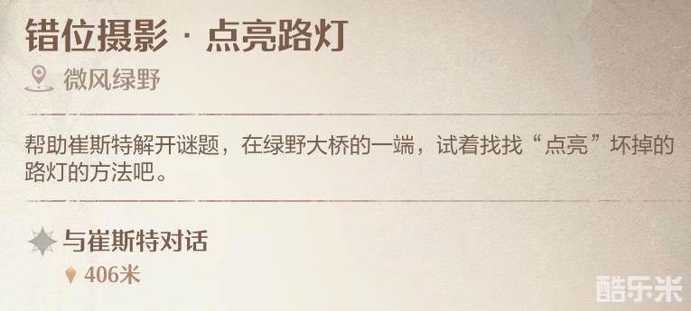 无限暖暖错位摄影点亮路灯任务需要帮助崔斯特解开谜题,在绿野大桥的一端,试着找找“点亮”坏掉的路灯的方法吧。下面酷乐米小编给大家带来的《无限暖暖》错位摄影点亮路灯拍照攻略,感兴趣的小伙伴们一起来看看吧。