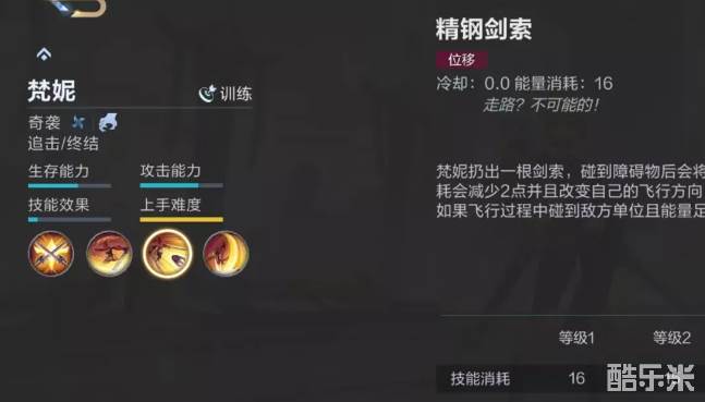 在飞行过程中,会根据飞行速度,提升对目标造成的伤害,同时为目标添加猎物标记。当技能命中被标记敌人时,会恢复能量。一技能旋转刀锋,对周围敌人造成伤害,二技能则是扔出一根钢索,钢索会将自己朝指定方向拉过去,该技能可以连续使用,并在中途改变自己的飞行方向,当身上能量足够的时候,命中敌人会触发一技能,大招是朝着目标进行突袭,造成大量伤害。