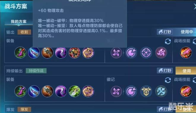 在出装方面,因为自身走的是打野路线,所以必要的打野装备是肯定要出的,后续装备可以推荐七海霸主之刃,大幅度提升物理攻击力和生命上限,以及附加物理穿透能力。另外一件是战灵的咆哮,增加物理攻击,附加破甲和摧坚效果,这些都是收割神器。