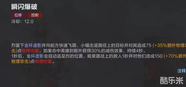 如果周围没有其他队友时,自身伤害提升,一技能加速效果,并强化普攻。二技能向前方冲刺,对路径上遇到的敌人造成伤害短暂延迟后,将路径上的敌人眩晕。大招可以将敌方英雄拉入到自己的领域中,然后自身切换到另一个烈形态,在此形态下双抗大幅度提升。