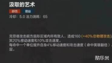 第一项技能是汲取的艺术,在此技能激活时,角色会在其正前方展开一个扇形状的影响区域。一旦敌人踏入这片区域,他们将承受相当于角色60%的物理攻击力伤害。尤为重要的是,若敌人恰好位于该区域的中心地带,他们还将额外受到角色总物理攻击力40%的增幅伤害,并且他们的移动速度会减慢,同时攻击速度也会下降10%。每当此技能成功命中一名敌人,角色的移动速度与攻击速度都将获得小幅提升,最多可提升4%,这种增益效果可累积,持续时间长达6秒,且最多可叠加至五层。