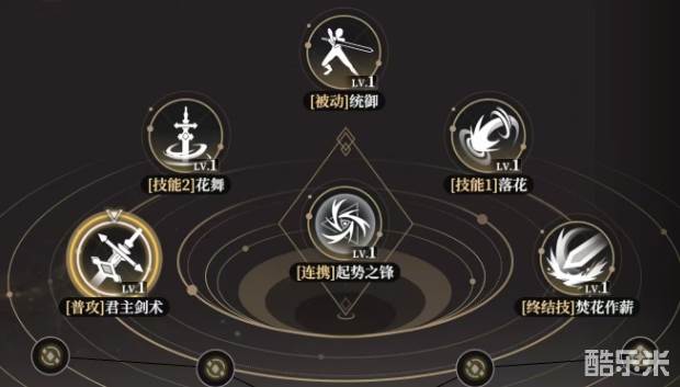 第2个主动技能花舞,旋转跃起下劈造成常规伤害,释放此技能后进入统御状态,在统御状态下,此技能替换为派生技能繁花怒放。繁花怒放的效果是旋转一圈后奋力下劈,造成三次大范围伤害,释放时君主之势的层数越高伤害也就越高,释放结束后会将所有的君主之势移除。