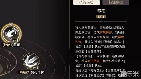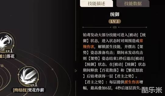 在统御状态下,会对周围造成常规伤害并解锁出派生技能,同时摆出架势准备反击,在期间如果未发动攻击,那么架势姿态结束一秒后退出此状态。在此状态下释放百花散落和繁花怒放后,铂鸢都能获得一层君主之势,该效果是每层提供派生伤害增幅,最高可叠加到6层。第1个主动技能是落花,将手中大剑投掷出去,对路径上敌人造成伤害和击退,随后将大剑收回,敌人也会被拉至身前。该技能使用之后就会进入到统御状态,在此状态下该技能将会替换为百花散落。白花散落释放之后也会进入到统御状态,常规状态下,每释放三次百花散落,都可以加速繁花怒放的释放。