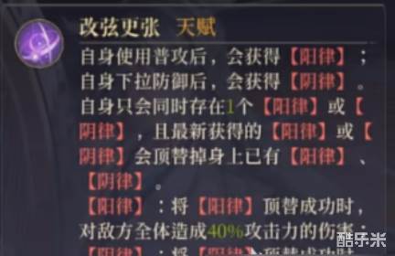 至于曹植的天赋“改弦更张”,这个技能的妙用就在于他能够灵活地应对不同的战局。普通攻击后,曹植会获得“阳律”或“阴律”状态,而这两者的不同效果,决定了他在战斗中的定位。阳律可以让曹植对敌方造成持续的伤害,而阴律则能提升队伍的免伤效果,为队友提供更强的生存能力。