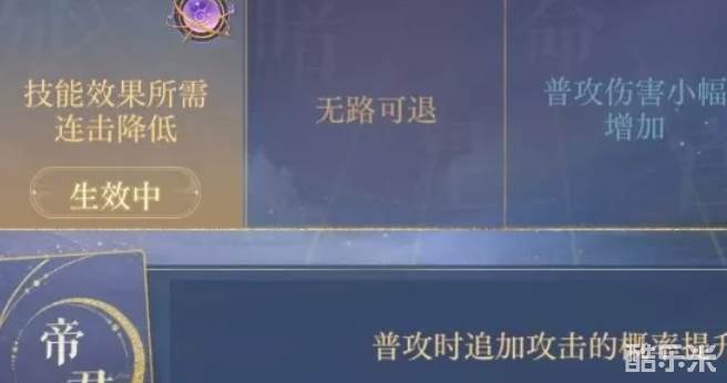 命盘方面,关键的橙色命盘包含“无路可退”普攻概率额外1层连击,但防御会损失所有连击。“技能也能获得连击”,故名意思用技能的时候也能得到1层连击。“追加攻击概率提升”,普攻追击概率加25%。“技能效果所需连击降低”,额外额外效果所需连击层数减少1个。