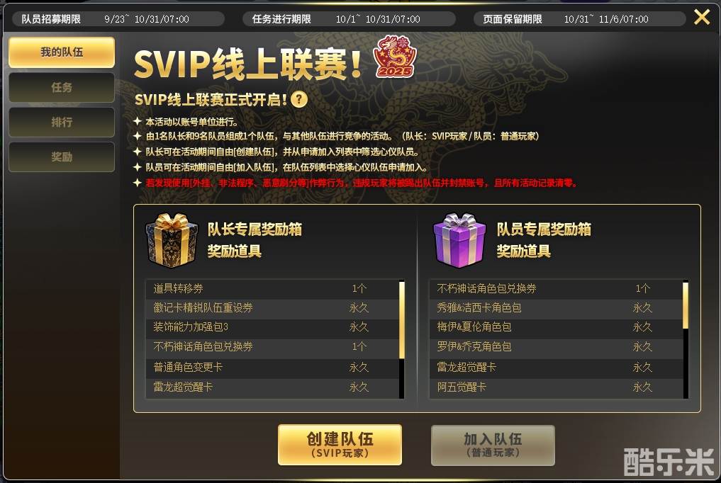 1.所有SVIP玩家可创建队伍成为队长,其他玩家可通过申请加入成为队员!(本活动以账号单位进行)由1名队长和9名队员组成1个队伍