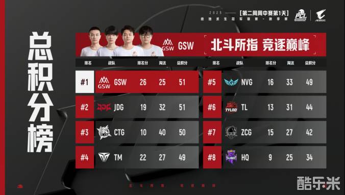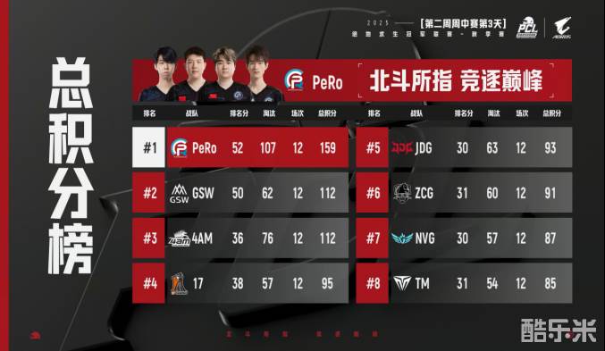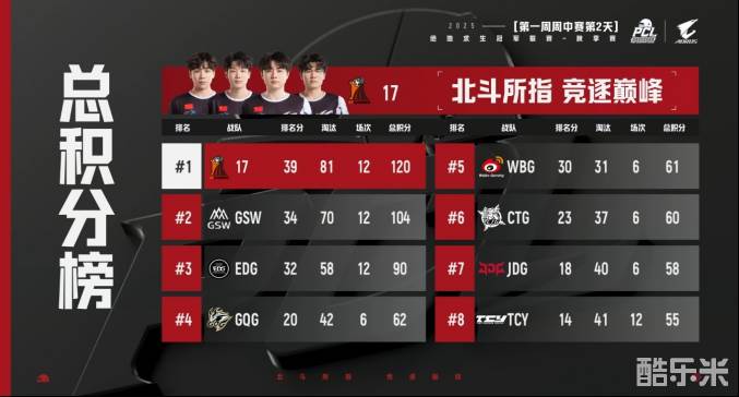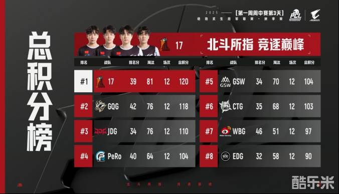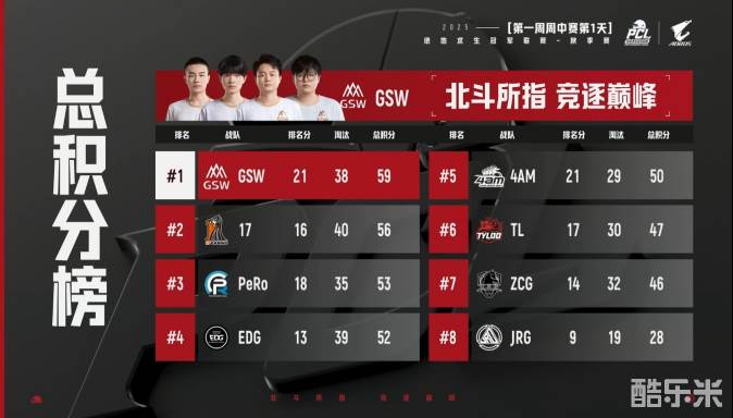 首日赛后,GSW凭借着59的总积分暂居第一,随后是17战队和PeRo战队,战神榜第一名则是给到了PeRo战队的Aixleft。