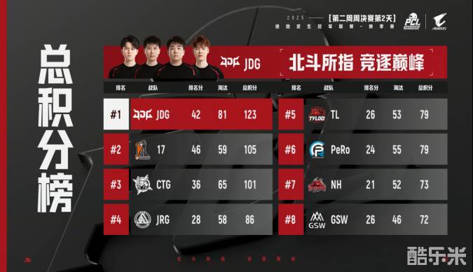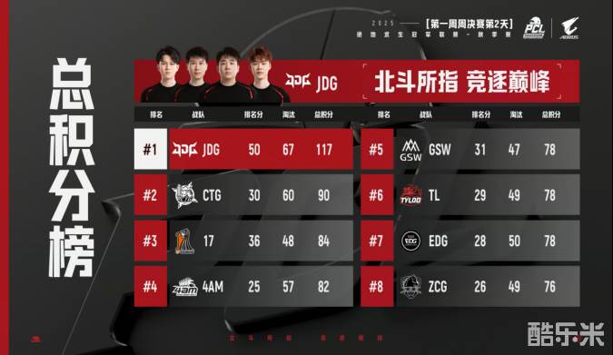 到了第二天,JDG在周中赛的状态继续保持,在前两把中分别和17战队、JRG战队打得火热,拿到了不少的分数点。17战和4AM作为老牌强者,虽然在前面几场表现并不是很出彩,但在本日的后半部分则是一直在前4中亮眼,让自己有了继续站在前5的底气。