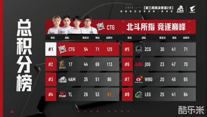 随后的几场,17战队、4AM、CTG等老牌战队的底蕴则是进一步被激发,在每局的最后4强中不断得分。