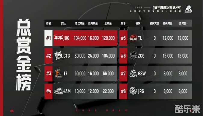 至此,PUBG的2025秋季赛常规赛阶段全部结束,而CTG则是成为了本次常规赛的榜首。在总赏金榜上,JDG战队以12万的总额高居第一,随后是CTG和17战队。